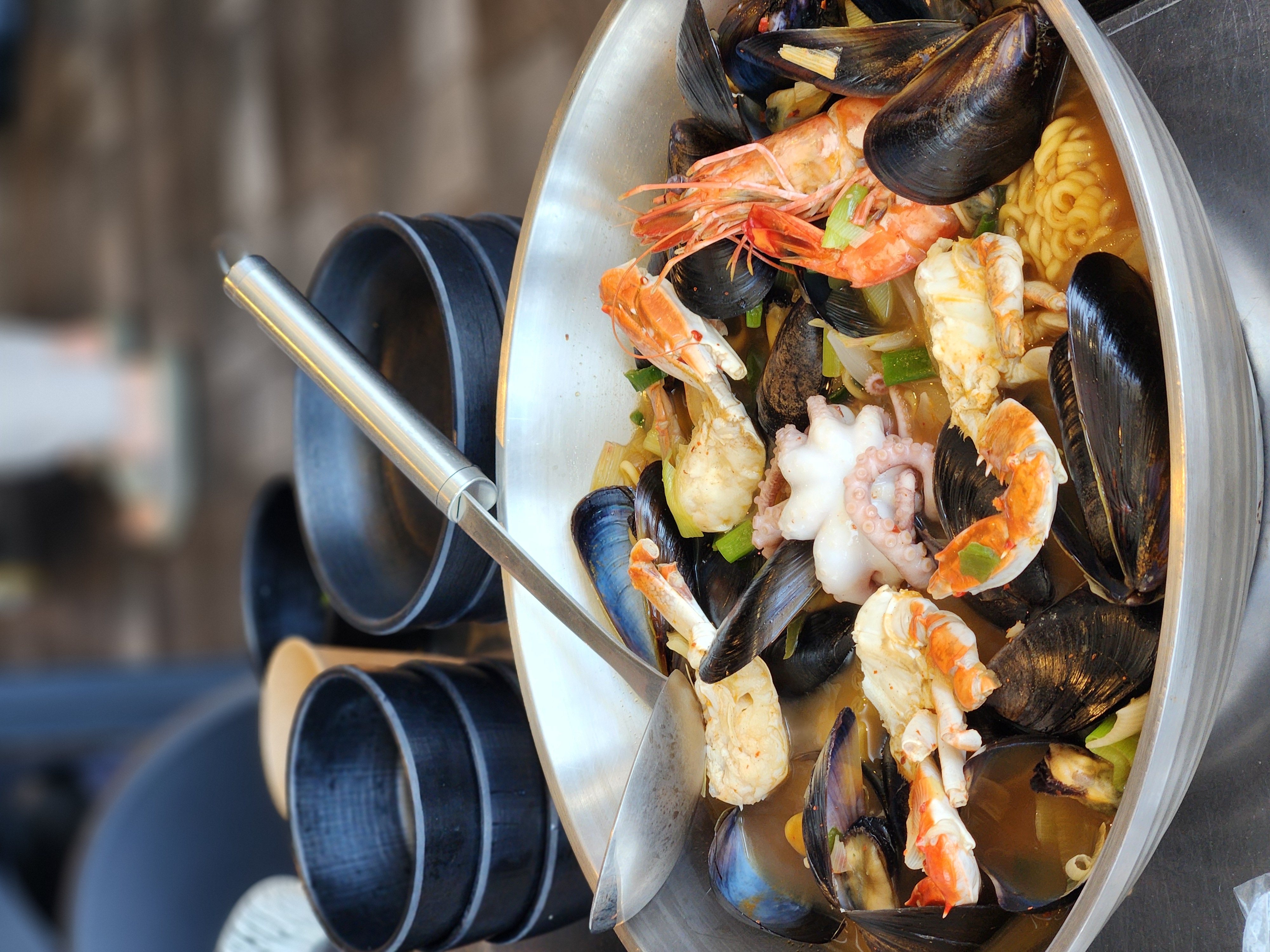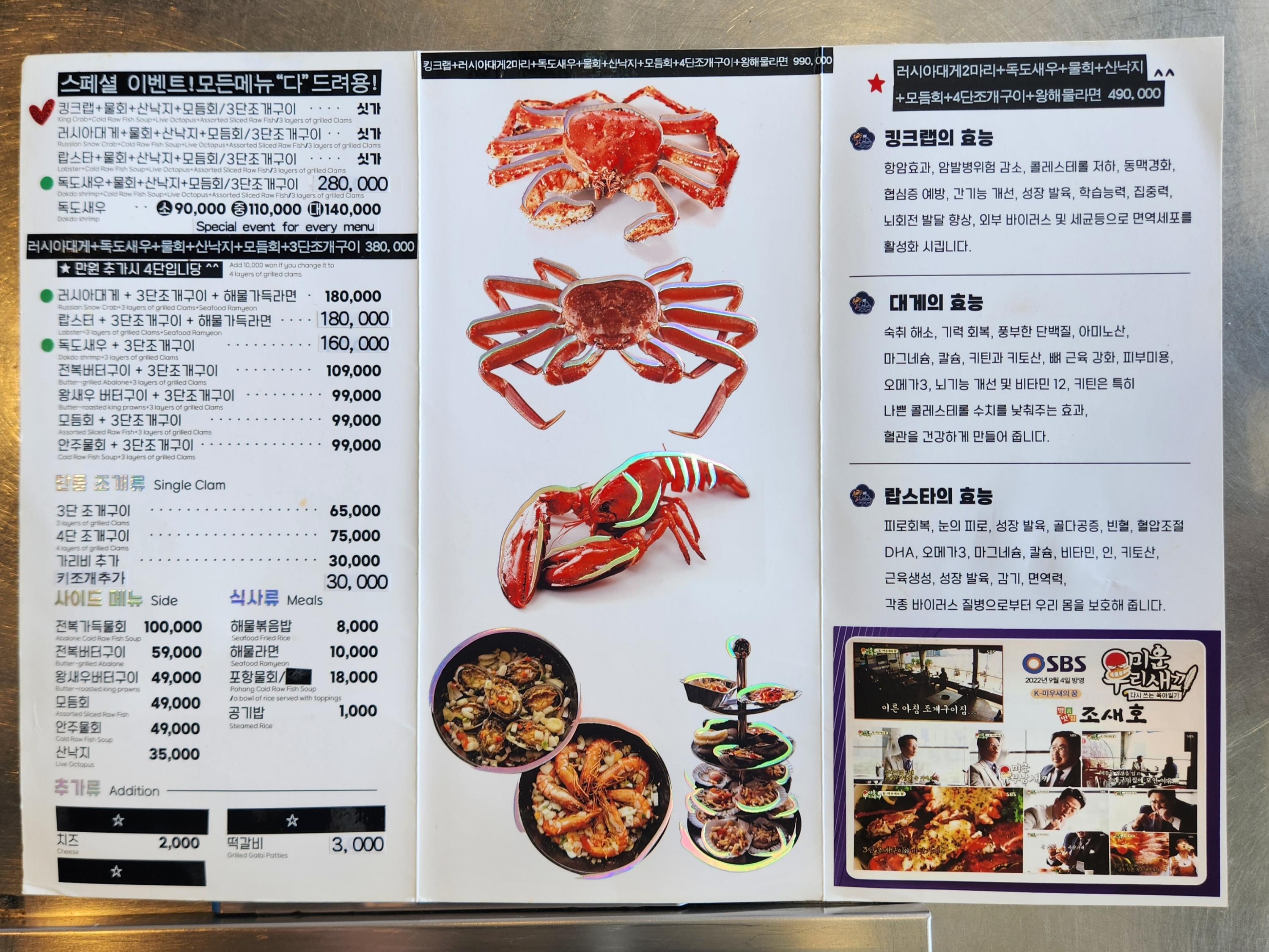 저희는 원래 랍스터 먹으려고 했는데ㅜ 오늘 랍스터가 없고 독도새우랑 대게가 있다고 해서 아쉽지만 대게로 주문했어요. 그래서 러시아대게+3단 조개구이+해물 가득 라면으로 선주문했습니다.